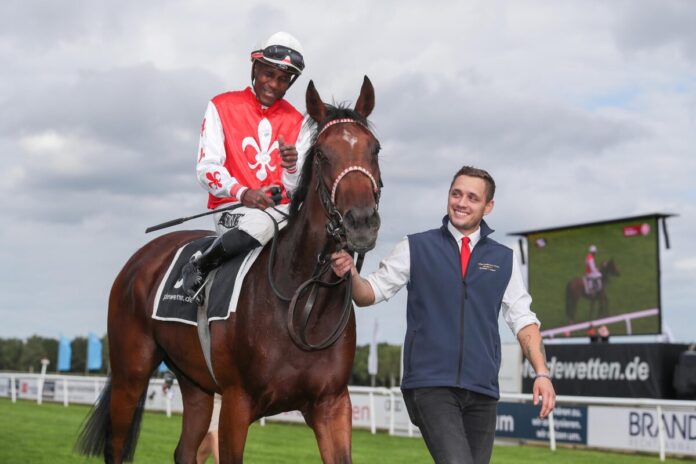 Mit Goldaue (Rene Piechulek) aus dem Stall von Marcel Weiß ist ein zweites deutsches Pferd in dem 66.000 Euro-Rennen.