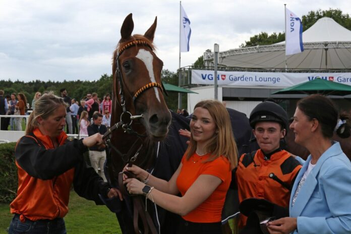 Die von ihr vorgestellte Debütantin Elegant Lips gewann nämlich eine Kampfpartie unter Erlaubnisreiter Tomas Roman, der nach dem Erfolg mit Storm Kodi zum zweiten Sieg des Tages kam. Elegant Lips entspringt der Zucht des Stalles Parthenaue und vertritt die Farben des Rennstalles Germanius.
