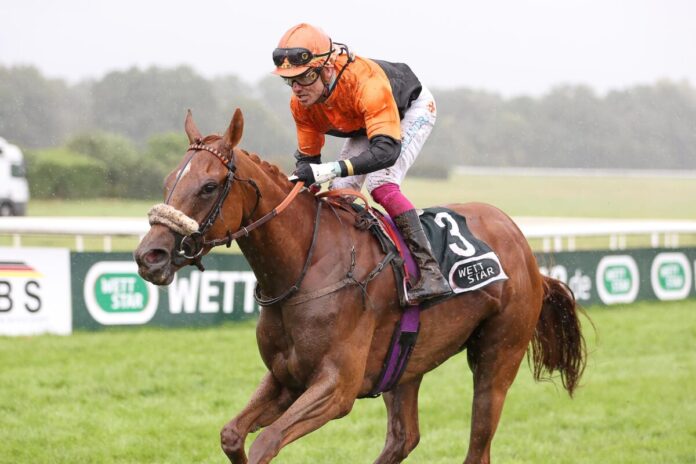 Geritten von Bertrand Flandrin ließ die Stute aus dem Iffezheimer Quartier von Gerald Geisler Koffi Esprit auf dem immer weicher werdenden Boden am Ende keine Chance, Rang drei ging an Rambazamba.
