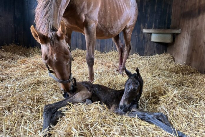 Jetzt hat es in England geklappt. Am Dienstagmorgen brachte die 21jährige Fuchsstute in den Millfields Stables bei Newmarket ein gesundes und munteres Stutfohlen von Cracksman zur Welt.