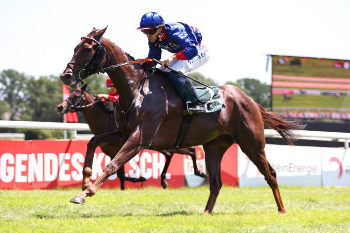 Und nach mehreren guten Platzierungen reichte es für den von Graf und Gräfin von Stauffenberg gezogenen Amaron-Sohn nun auch zu seinem ersten Sieg. Nach einem Rennen von der Spitze aus setzte sich der Wallach als 2,4:1-Chance unter Champion sicher gegen Rockshalaa (Axel Kleinkorres/Bolot Kalysbek Uulu)