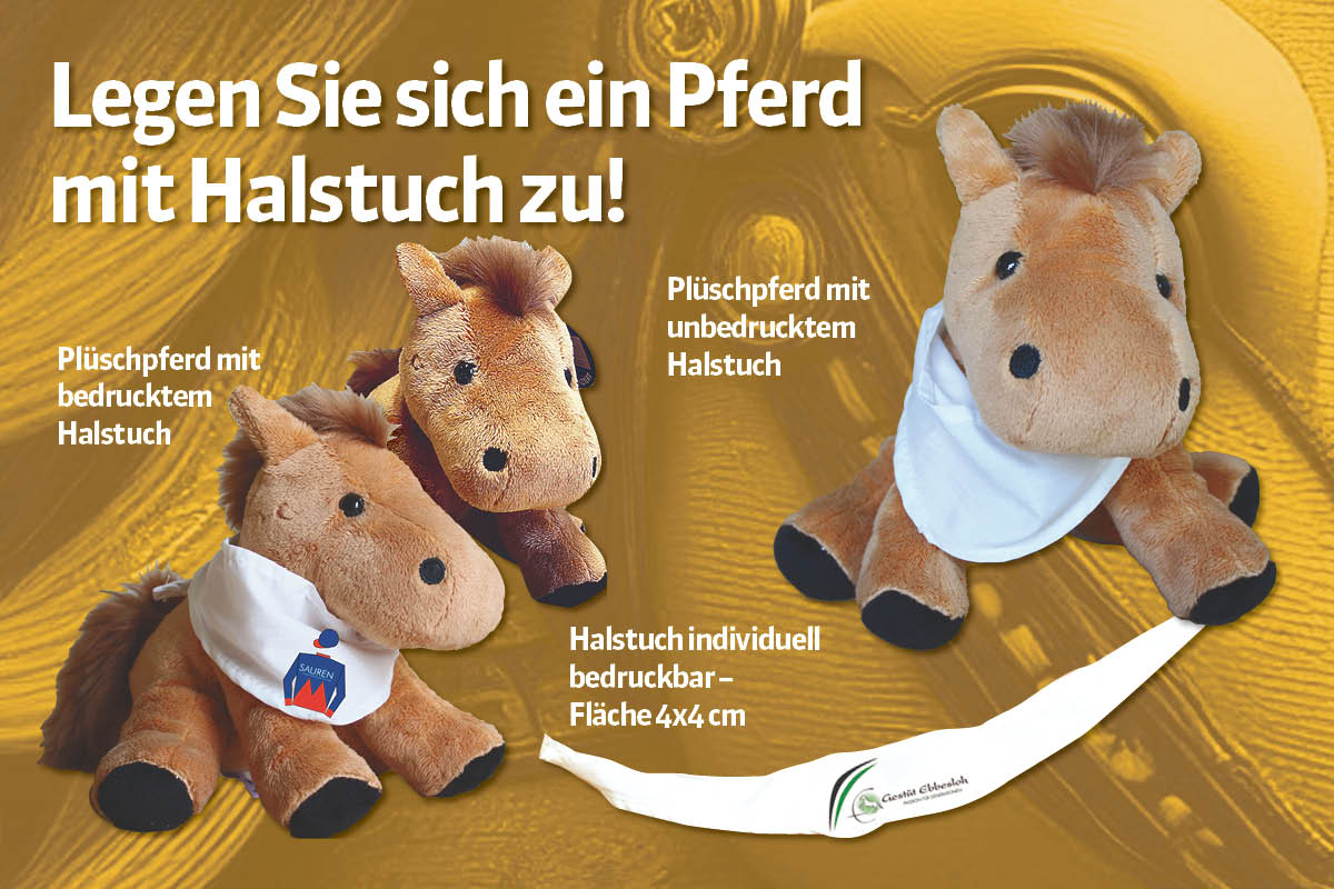 Bestellen Sie jetzt das niedliche Plüschpferd der Sport-Welt mit individuell bedrucktem Halstuch oder in der Standard-Variante mit unbedrucktem Halstuch.