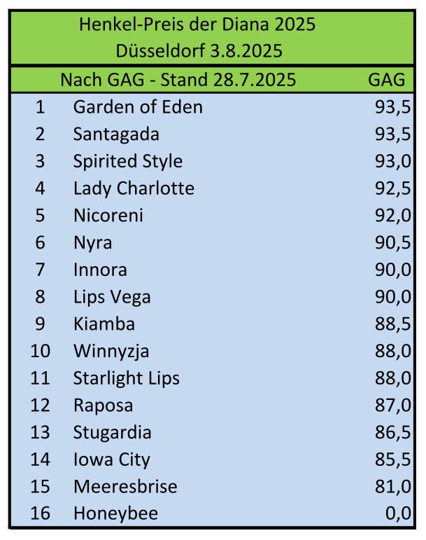 Chefhandicapper Harald Siemen hat die stehengebliebenen Pferde im 167. Henkel-Preis der Diana in eine Rangfolge gebracht nach der am Montag erfolgten Streichung.