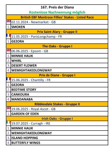 Wie für das Deutsche Derby gibt es auch für den Henkel Preis der Diana in diesem Jahr die win and you are in-Regel für die Siegerinnen bzw. Top-4-platzierten Stuten in ausgewählten internationalen Rennen.